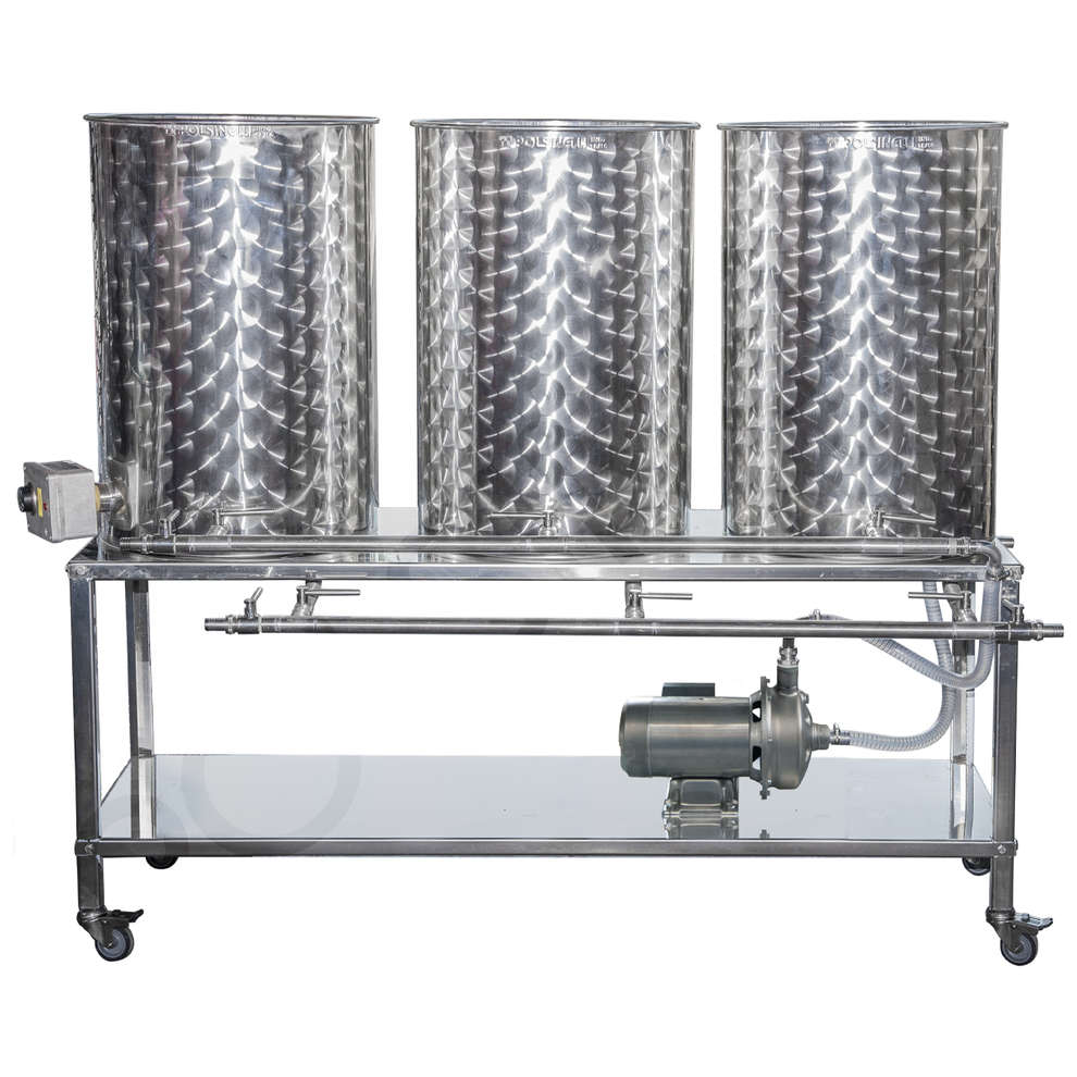 Het CIP-wassysteem (Clean-in-place) maakt het mogelijk om de interne oppervlakken van leidingen, tanks, apparatuur, filters en gerelateerde verbindingen te reinigen zonder demontage. Bovendien zorgt de trolleyomhulling voor maximale mobiliteit van de hele constructie. RVS elektrische pomp: 0,75 kW; debiet 110 l/m; PK 1; T/max 110°. Meestal wordt het gebruikt met: 1 – alkalische oplossing, ontkalker; 2 – ontsmettingsoplossing met perazijnzuur; 3 – water of andere Dankzij het was-cip-systeem zal het een aanzienlijke besparing opleveren op zeep, soda, zuur en andere dingen, want zodra de oplossing van de eerste tank naar de te reinigen vergister wordt gestuurd (blauwe lijn), kunnen de kleppen van de tank worden gesloten en de recyclinginstallatie kan worden gebruikt (groene lijn). De “recovery”-buis (bruine lijn) wordt aan het einde van de ontkalker gekoppeld en de oplossing wordt, indien nodig, teruggewonnen voor een nieuw gebruik. De tanks moeten zijn uitgerust met een klep aan de onderkant en een klep aan de voorkant op 40 mm van de bodem. De oplossing moet vanaf de onderkant worden gevuld en aan de voorkant worden opgevangen om recycling van eventuele resten te voorkomen.